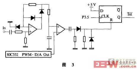 另外,為了防止干擾波及發(fā)射波寬度和多次回波的重疊對測量的影響,本設(shè)計在接收回波的電路中,增加了一個電平可變的門限,該電平由80C552的PWM脈寬調(diào)制端通過必要的接口電路形成的D/A轉(zhuǎn)換器的輸出提供。門限電平的高低應(yīng)盡量使產(chǎn)生回波的中斷時刻發(fā)生在靠近回波波形的中心位置,以減小波形寬度對測量時間的影響。