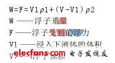 磁致伸縮式液位計出廠是根據用戶提供的“上密度”和“下密度”確定浮子的重量。在測量界面時,實際上是浮子浮在界面上,所受的浮力和重力相等。公式為: