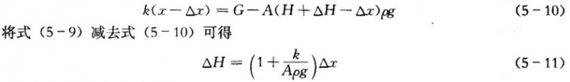當液位變化時,浮筒所受的浮力隨之變化,由于重力不變,要達到新的平衡狀態,浮筒的浸沒高度必然變化,使彈簧的張力也隨之而變。假定某時刻液位升高了△H,如圖5-7 所示,彈簧隨之被壓縮△x.則有