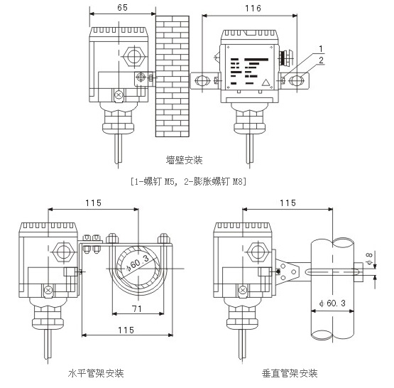 LK-LC/LR型投入式液位計(jì)變送器具有多種安裝固定方式,以適應(yīng)不同現(xiàn)場(chǎng)情況。當(dāng)現(xiàn)場(chǎng)不能夠提供G2的內(nèi)螺紋或法蘭等工藝設(shè)施時(shí),可選擇普通形式的液位變送器,它有墻壁安裝式、水平管架式和垂直管架式等叁種安裝方式可選擇,使您在現(xiàn)場(chǎng)安裝時(shí)得心應(yīng)手。